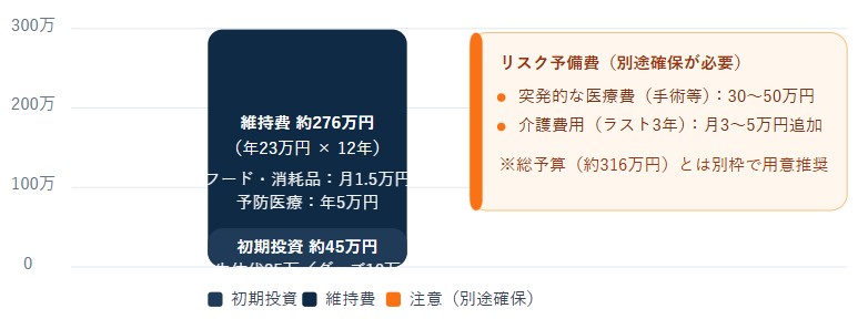 - 維持費約276万円=(フード・消耗品月額約1.5万円x12ヶ月+予防医療年間5万円)12年間